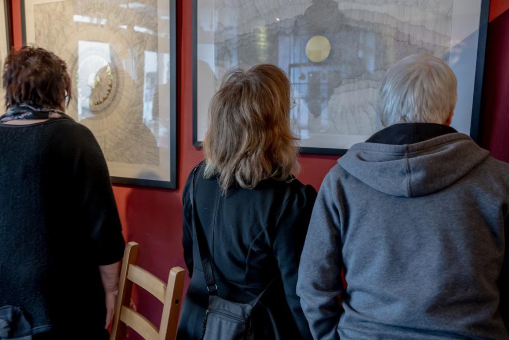 Bei André mag ich kein Bild hervorheben. Denn bisher bin ich noch bei fast jedem ein wenig versunken. Jedes seiner Werke hat eine zarte aber sehr präzise Struktur. Die Magie liegt in den Details. Man muss genau hinschauen. Es ist Verspieltheit, es sind Ornamente und abstrakte Gebilde, grob gewebte aber elegante Schleier. Die Bilder sind ein bisschen wie Andrés Weg zum Künstler selbst: Da sind Kreuzungen, Überschneidungen, Parallelen, Wellen und Resonanzen. Es sind Gewebe, die durch ihre scheinbare Bewegung eine Art Plastizität bekommen, verbunden mit einer sparsamen aber wirkungsvollen Farbgebung. Es mag meine subjektive Sicht als Musiker sein: aber ich finde, Andrés Bildern wohnt ein musikalischer Prozess inne. Er lässt seine Linien teilweise wie Saiten schwingen, die etwas anreißen, etwas zum Klingen bringen. – Andrés Kemnitz-Voigts Stücke sind ein wenig wie Jazz. Das geht auch aus seiner Beschreibung der Entstehung der Bilder hervor. – Es gibt ein zunächst noch diffuses etwaiges Konzept. – Er beginnt. – Er improvisiert, lässt es einfach fließen und irgendwann übernimmt die Hand. – Und so, wie er bemerkt, dass etwas entsteht, merkt er auch, das etwas fertig ist – beendet. Und wie ein Musiker, der sein Werk liebt ist auch er von Trauer erfüllt, dass es vorbei ist. – aber das nächste Stück ist schon im Entstehen begriffen.